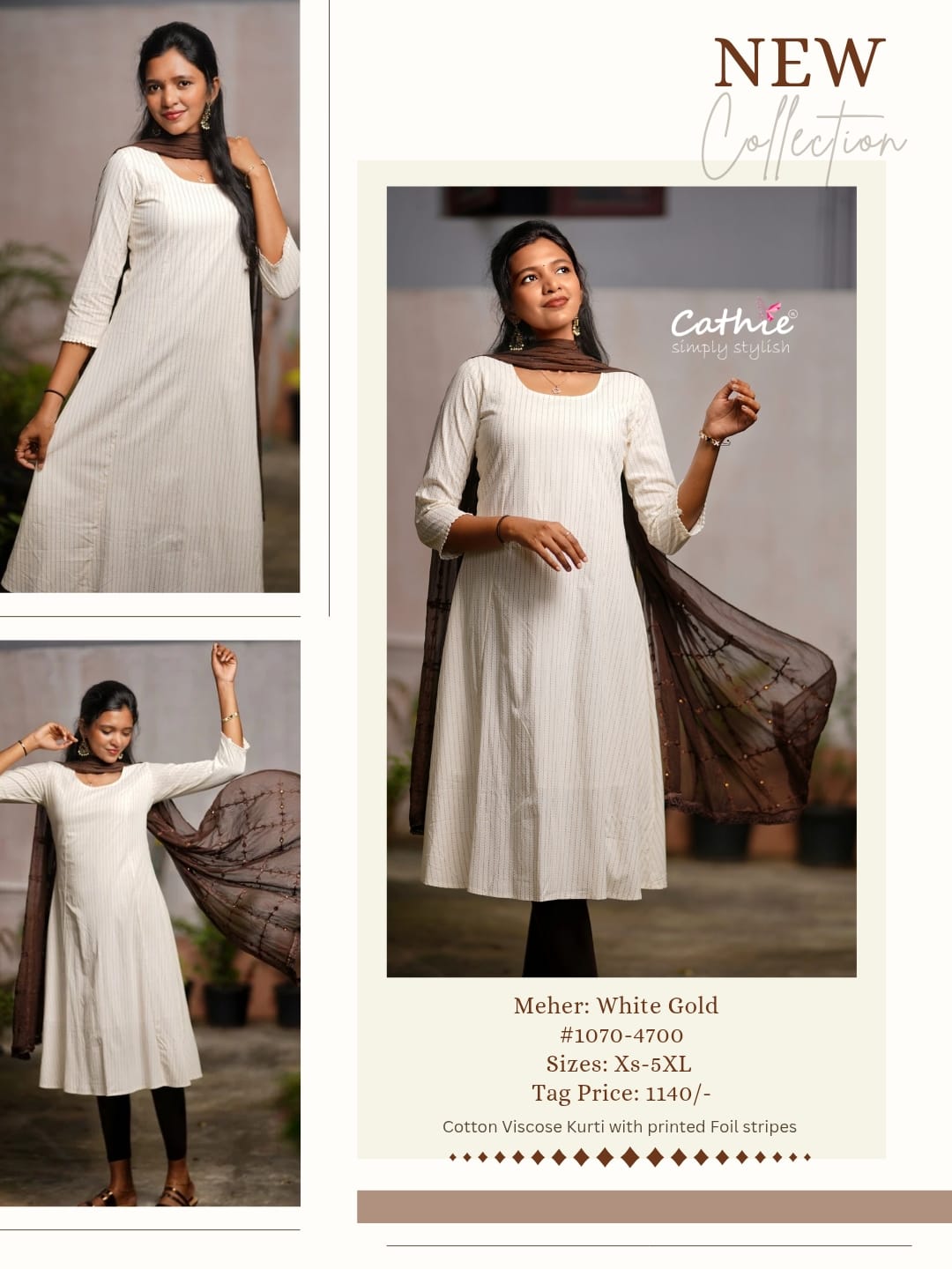 Cathie | Meher white gold | cotton viscose kurta with printed foil stripes